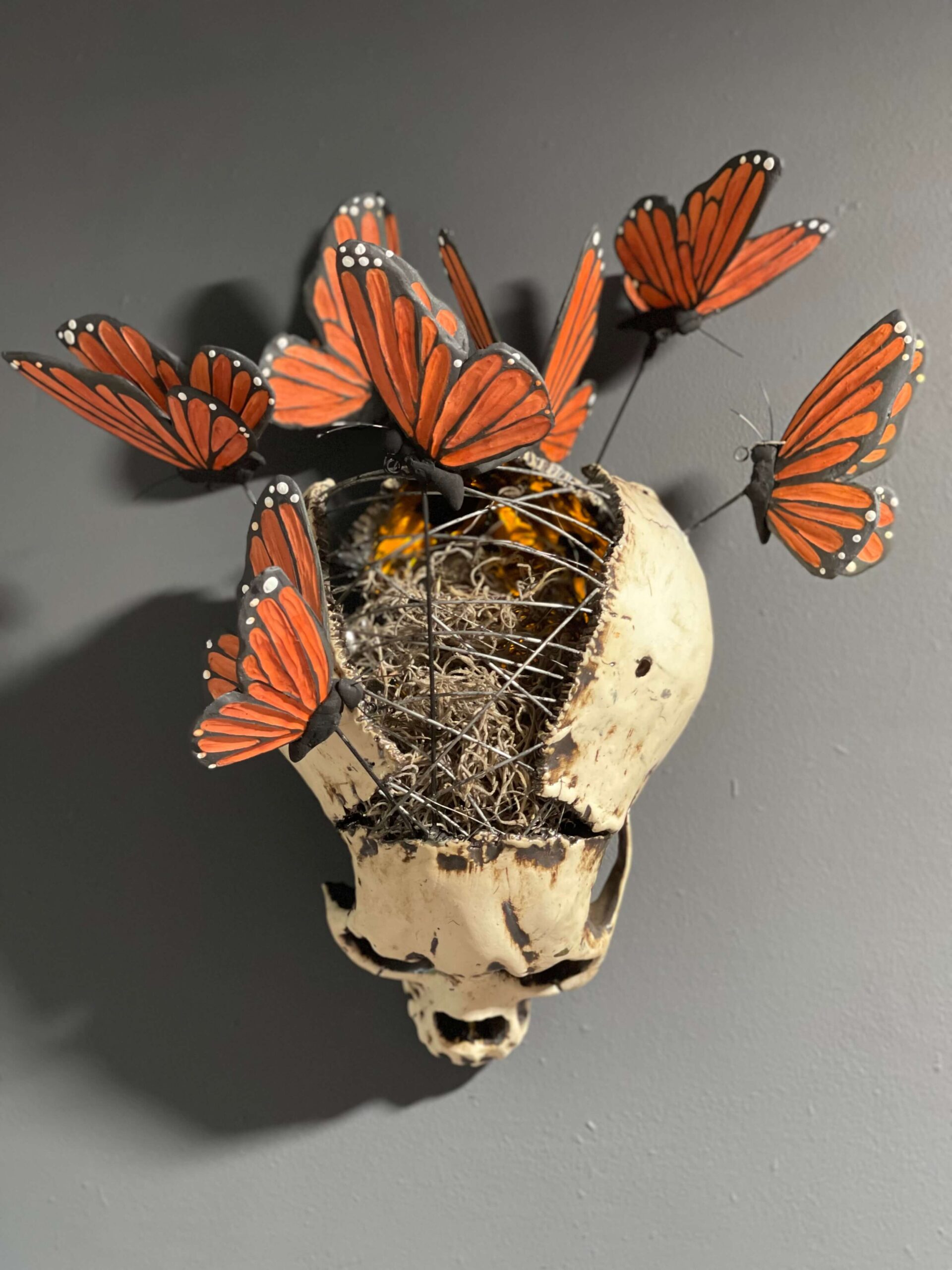 3rd Place – Horrible Darlings, Upcycling- Skull Scone w/ butterflies, Porcelain, 14x14x10, $650