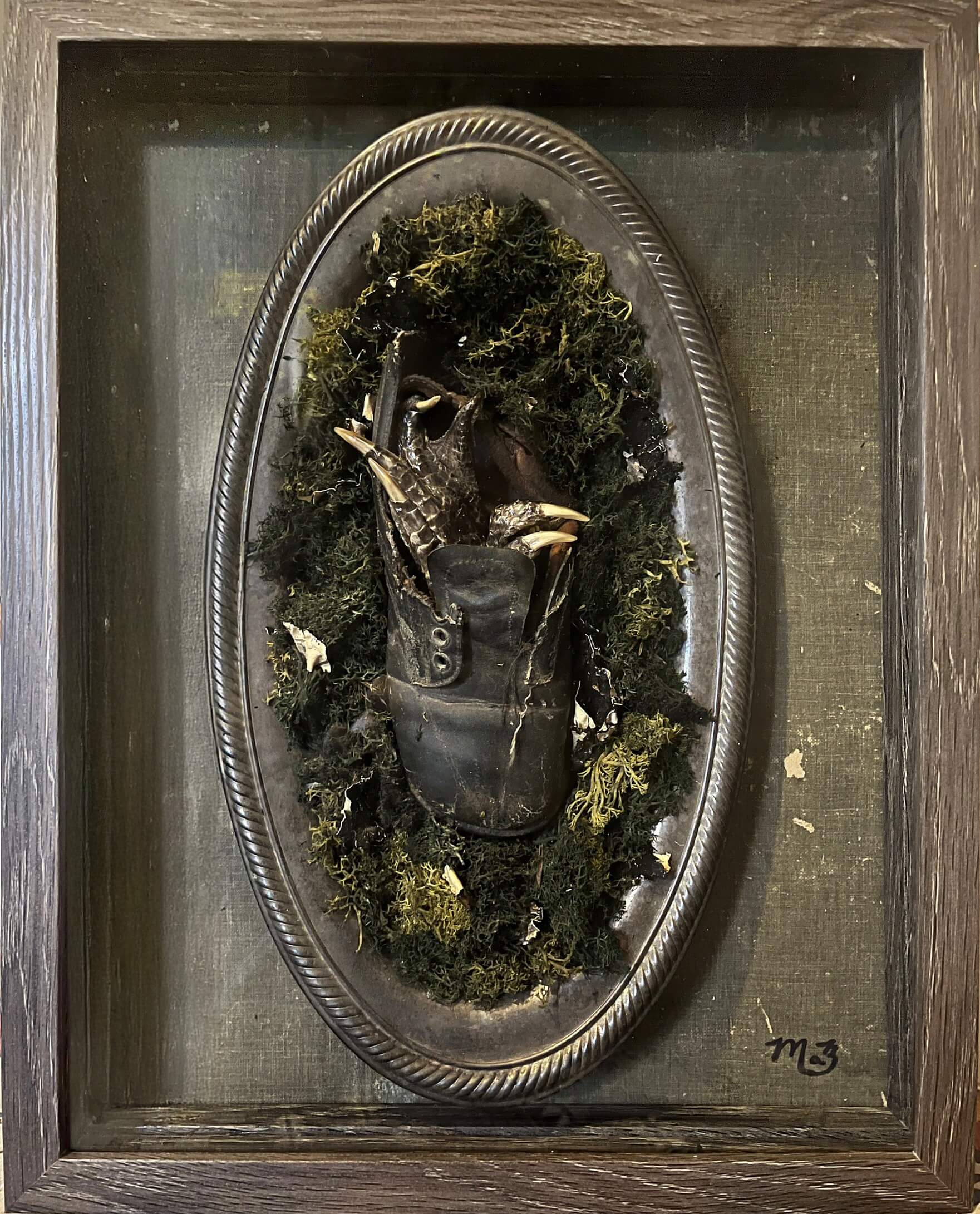 1st Place – Marissa Boyce, Es War Einmal, Mixed Media Alligator Claws, Leather Shoe, Moss, Pewter Tray, Antique German Children’s Book, 14×11, $175